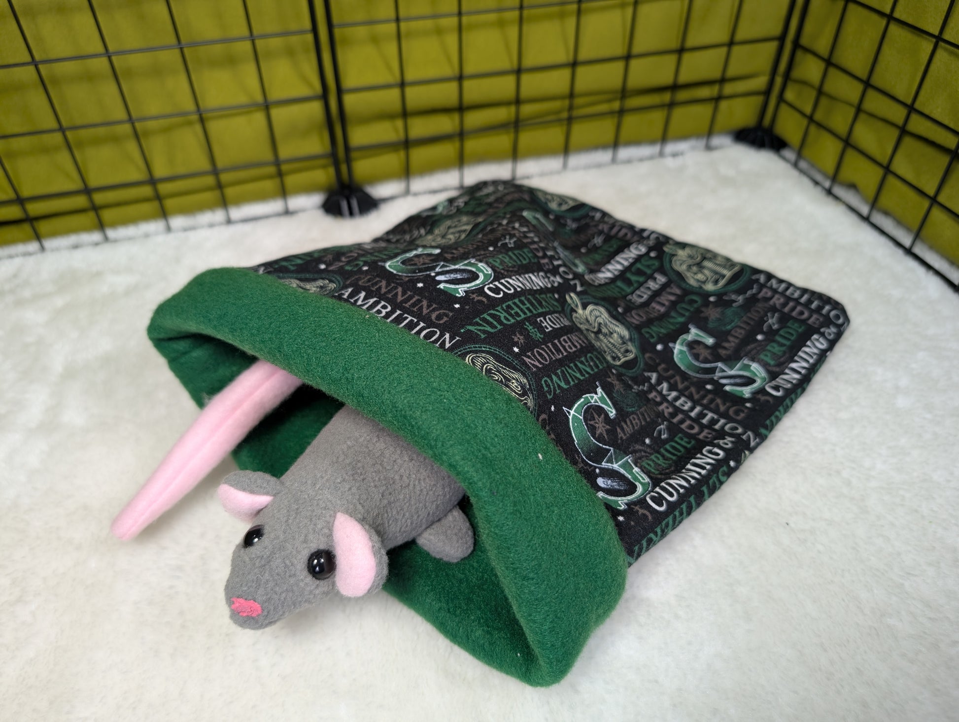 Bring the magic of Hogwarts straight into your pet’s cage with our 2-piece Slytherin cage set, designed for rats, ferrets, and other small mammals. This enchanting set includes a cozy bunk bed hammock and a soft snuggle sack, perfect for napping, hiding, or lounging in true Slytherin style.