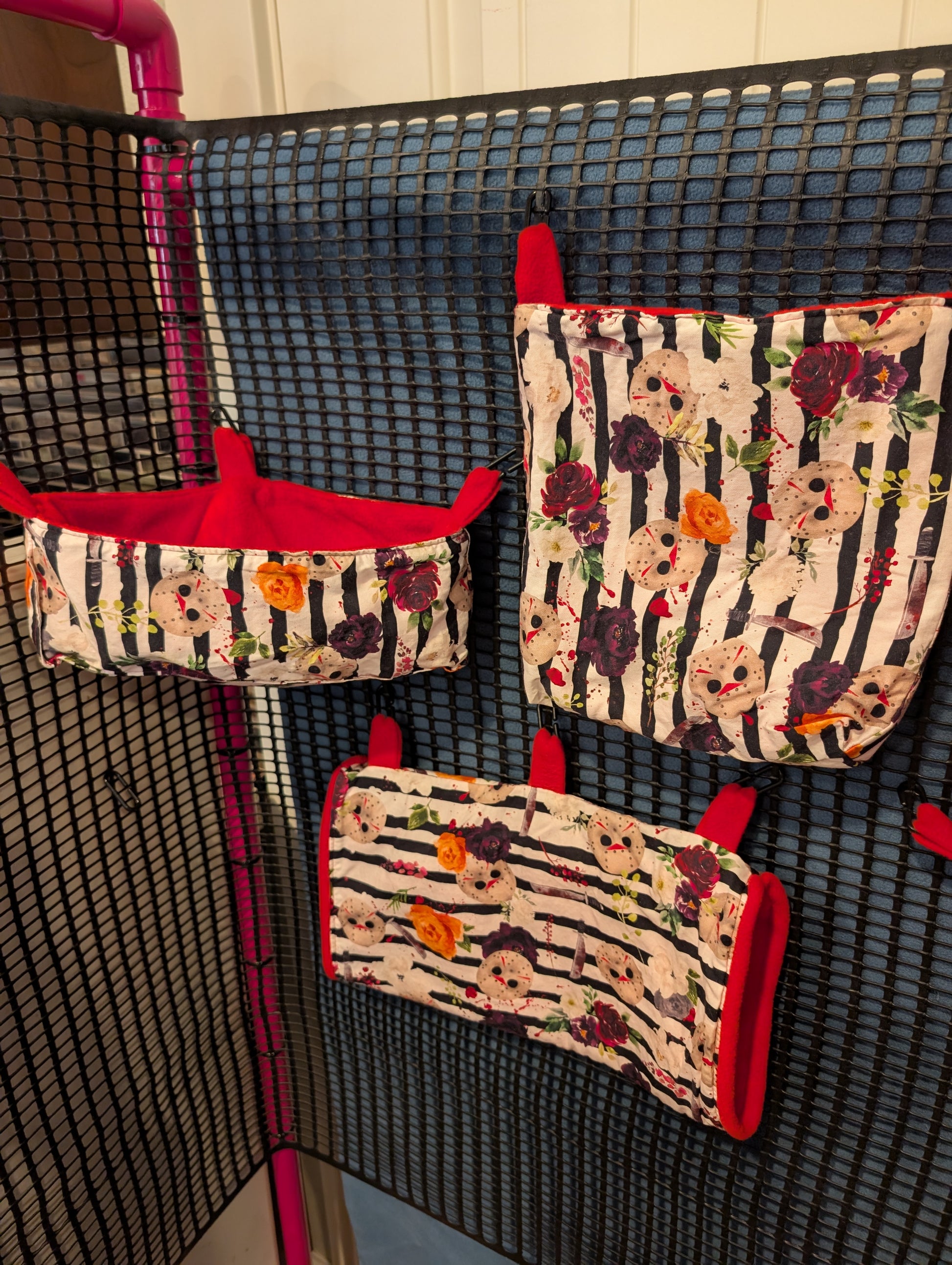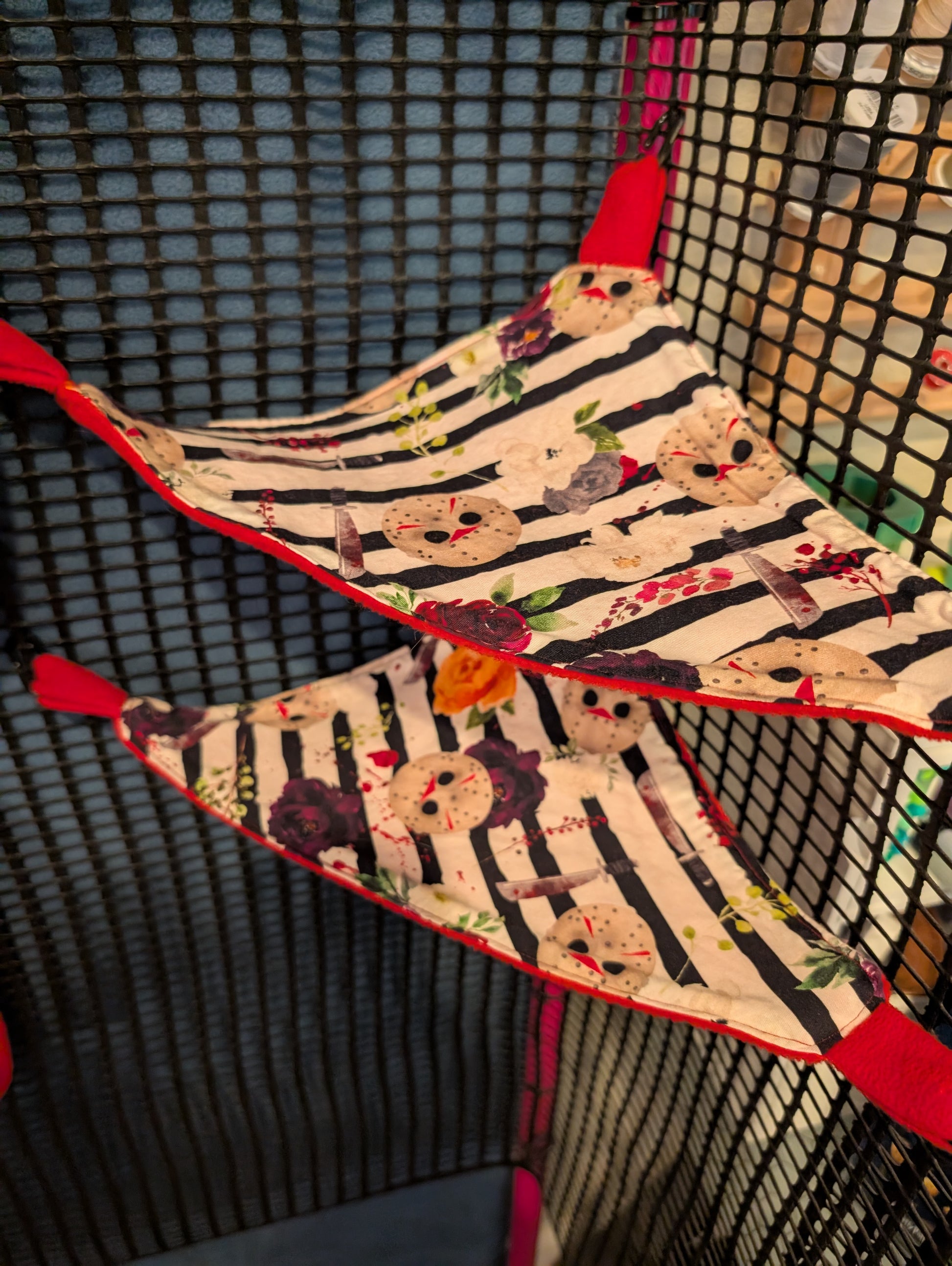 Bring a bit of Camp Crystal Lake into your sugar gliders’ world with this Friday the 13th themed cage set—where cozy comfort meets horror movie nostalgia. Crafted with licensed Friday the 13th cotton fabric and a blood-red fleece inner lining, this set is perfect for horror fans who want their small pets to lounge in spooky style.