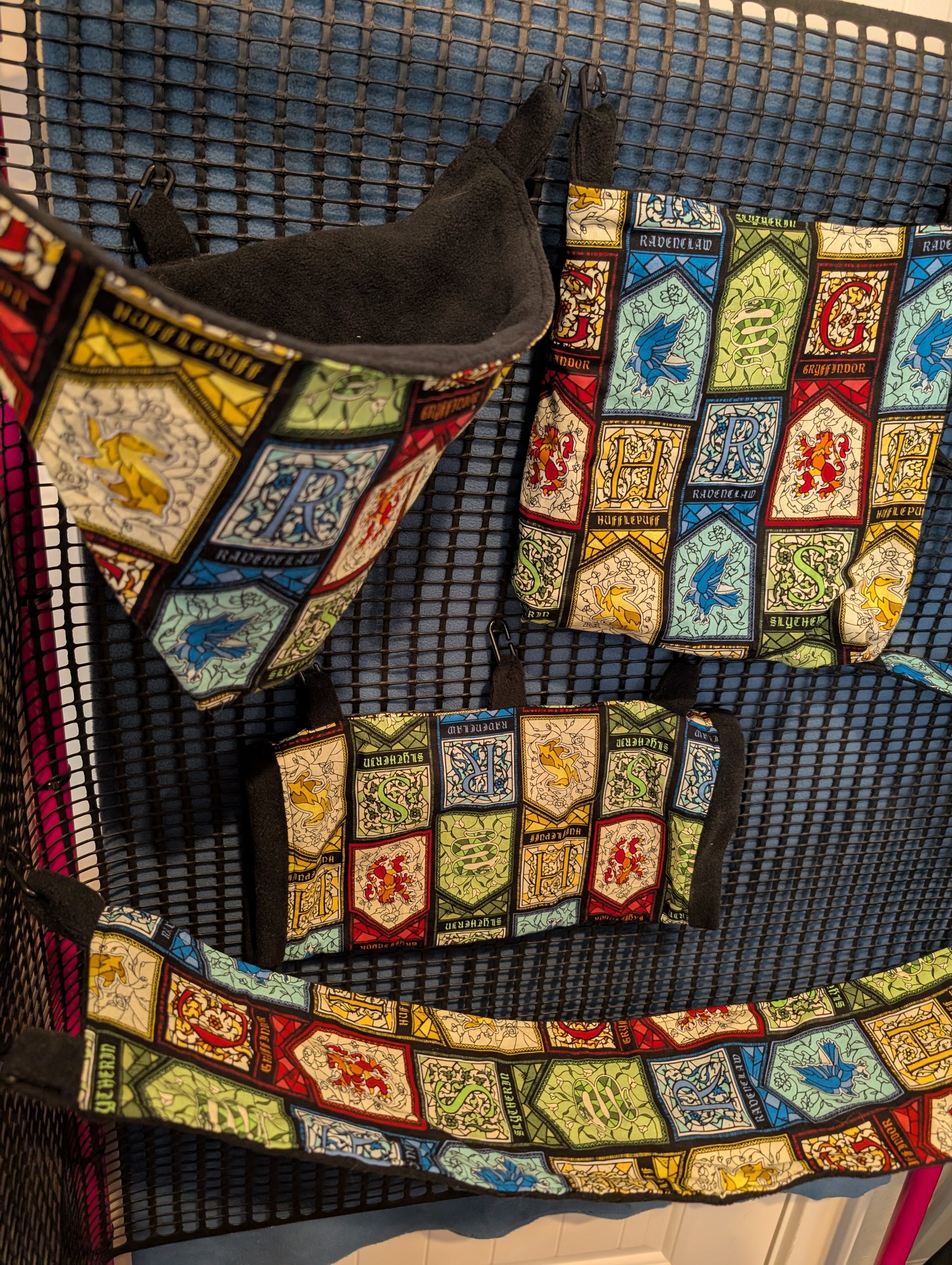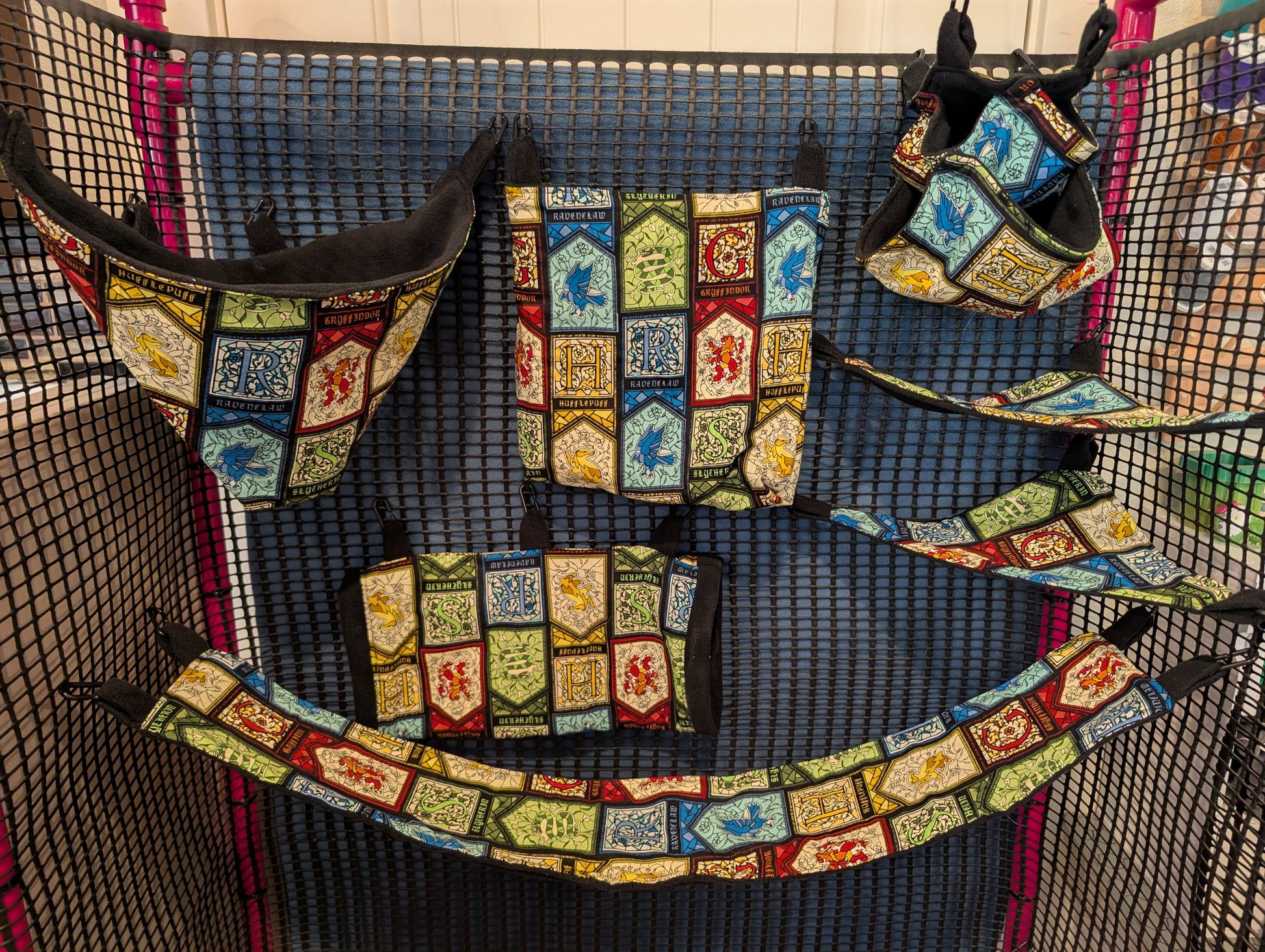 Bring a touch of magic to your pet’s home with our Hogwarts-themed 7-piece cage set! Perfect for true Harry Potter™ fans, this enchanting set features licensed character cotton fabric in a Hogwarts house design, paired with a color-coordinating fleece inner lining for ultimate comfort and style.
