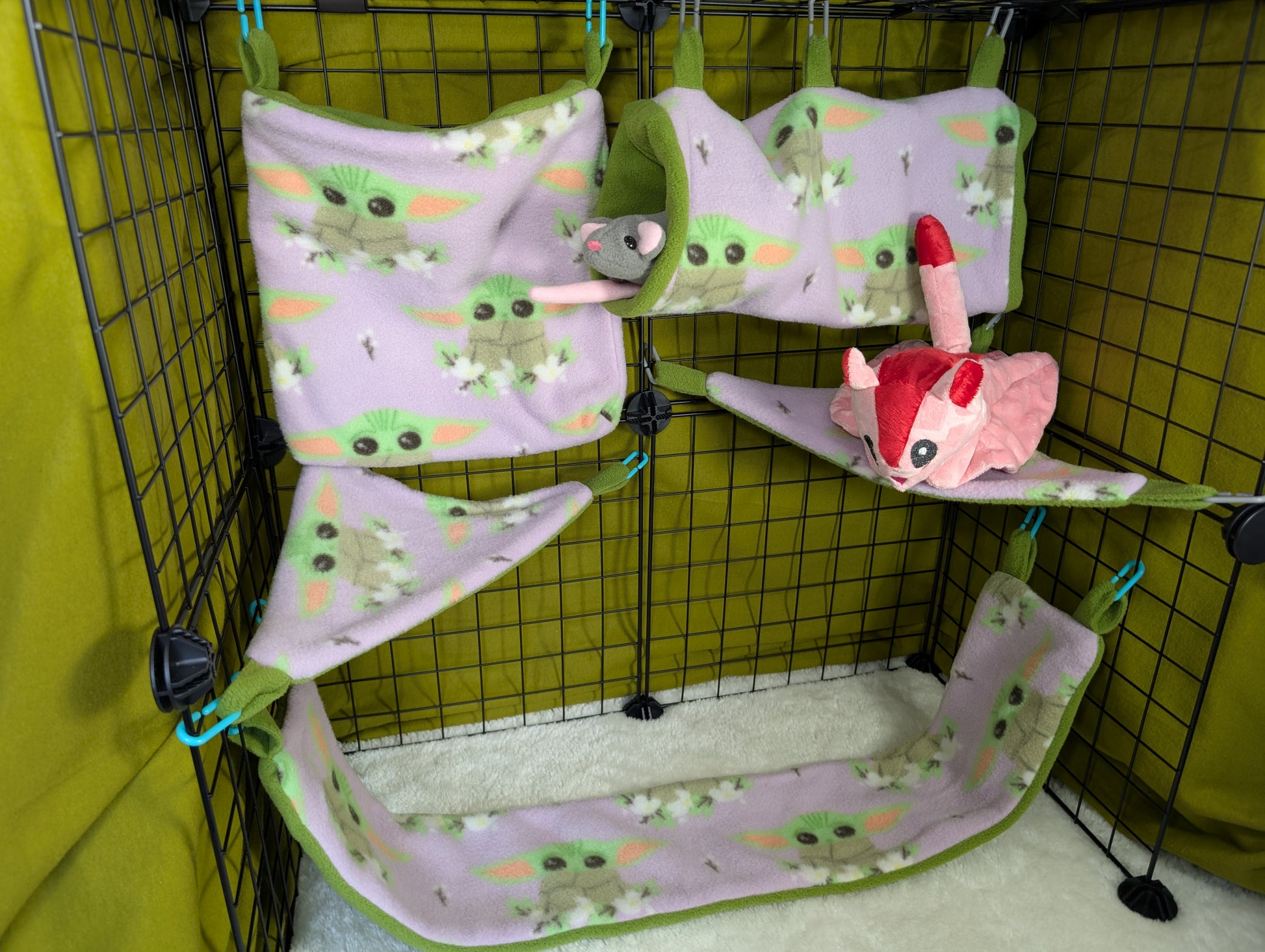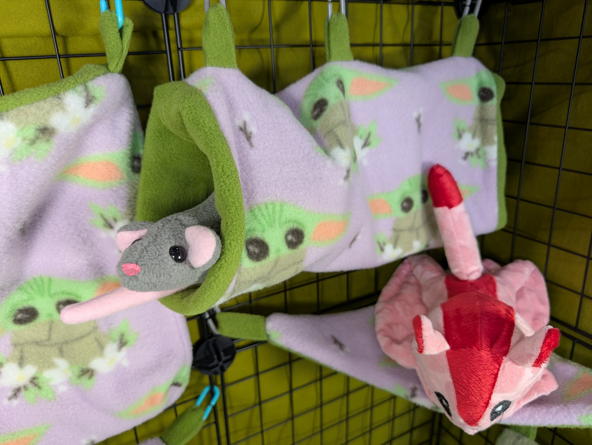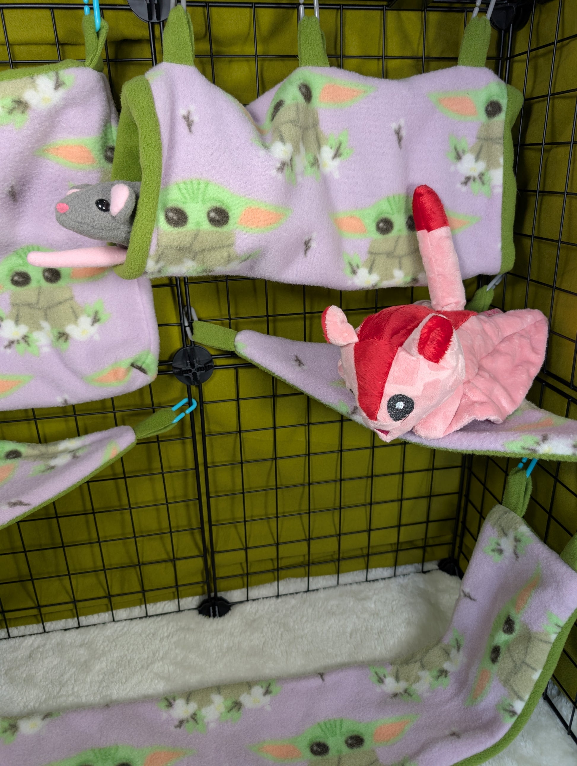 Crafted from licensed Star Wars™ Yoda print fabric and lined with color-coordinated fleece, this set is both stylish and snuggly. Hidden seams ensure a sugar glider-safe design, preventing snagging or loose threads.